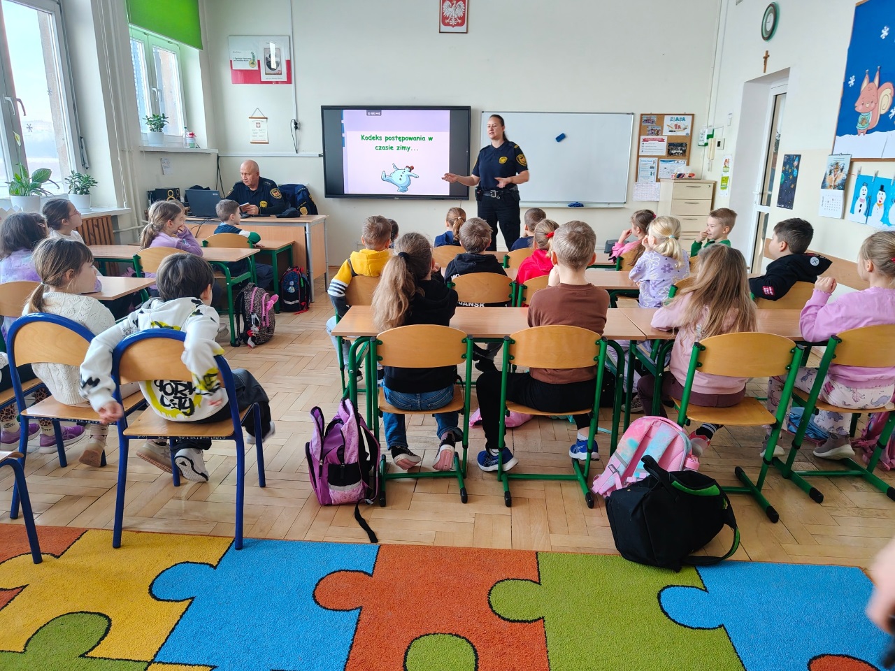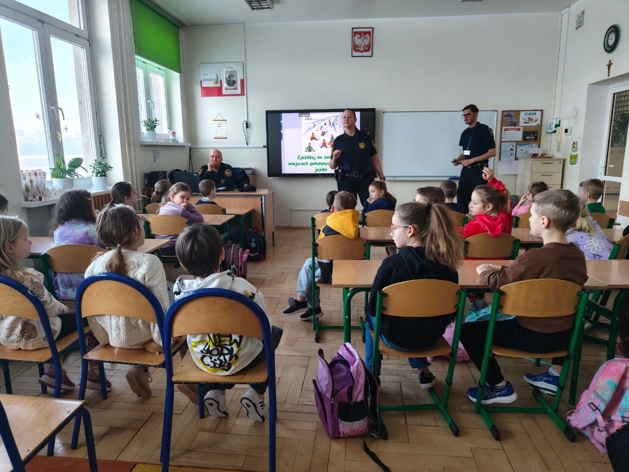 W ostatnim tygodniu przed feriami odbyło sie spotkanie przedstawicieli Policji i Straży Miejskiej z uczniami klas 1 - 8. Przypomniano zasady bezpiecznego spędzania czasu wolnego na śniegu i lodzie oraz sposoby postepowania w sytuacjach zagrożenia.