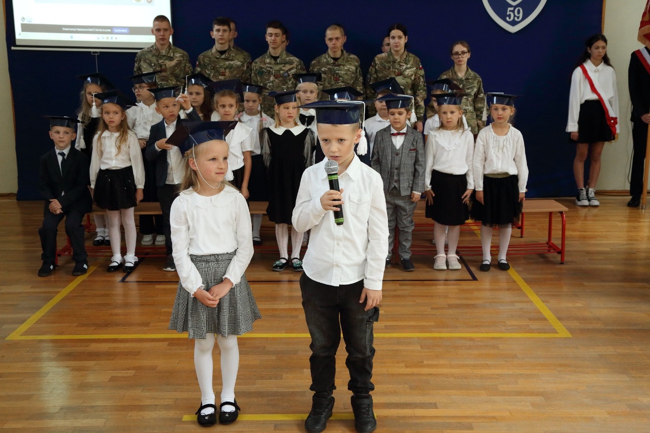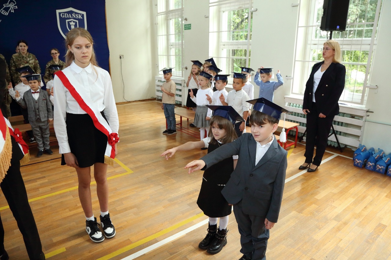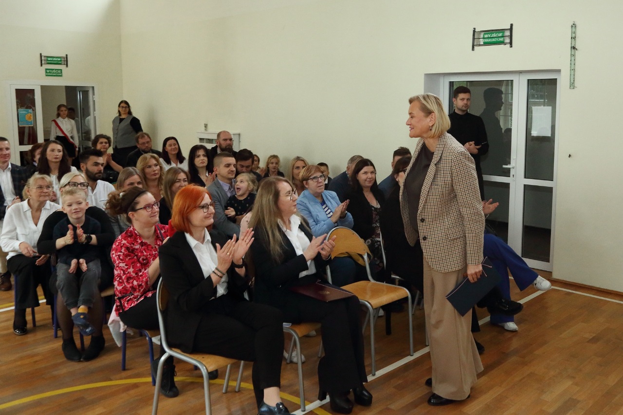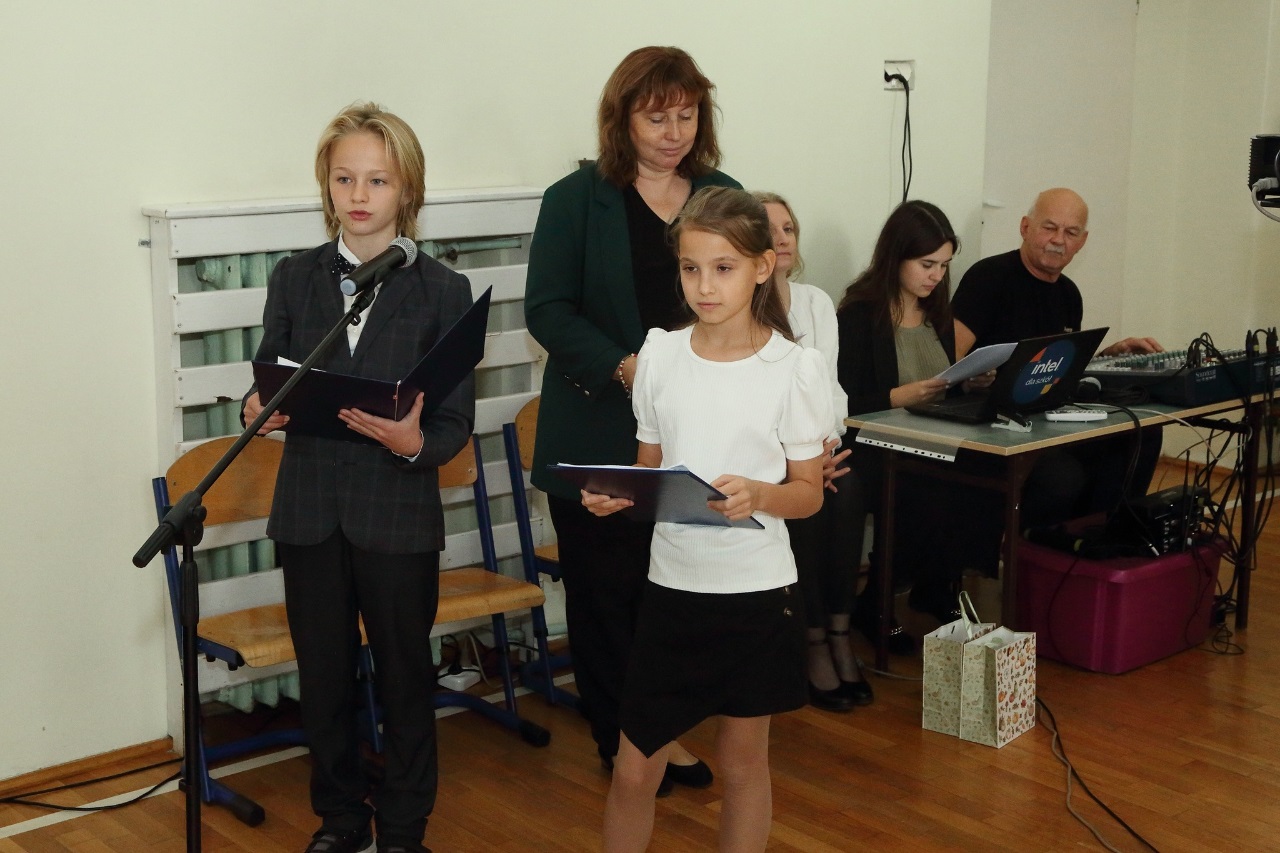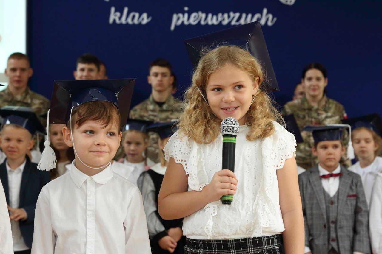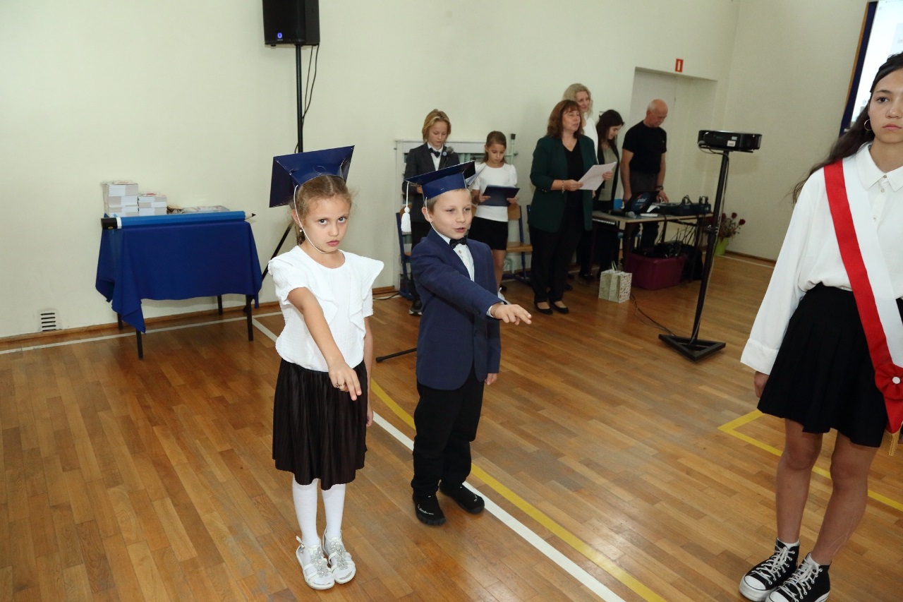 Najmłodsi uczniowie pięknie zaprezentowali się w programie artystycznym - były wiersze, piosenki i uśmiechy, które skradły serca wszystkich obecnych. Pierwszoklasiści pokazali również, że mają już wiedzę na temat szkolnego patrona. W trakcie występu zostali oficjalnie powitani w szkole przez uczniów klas starszych.
