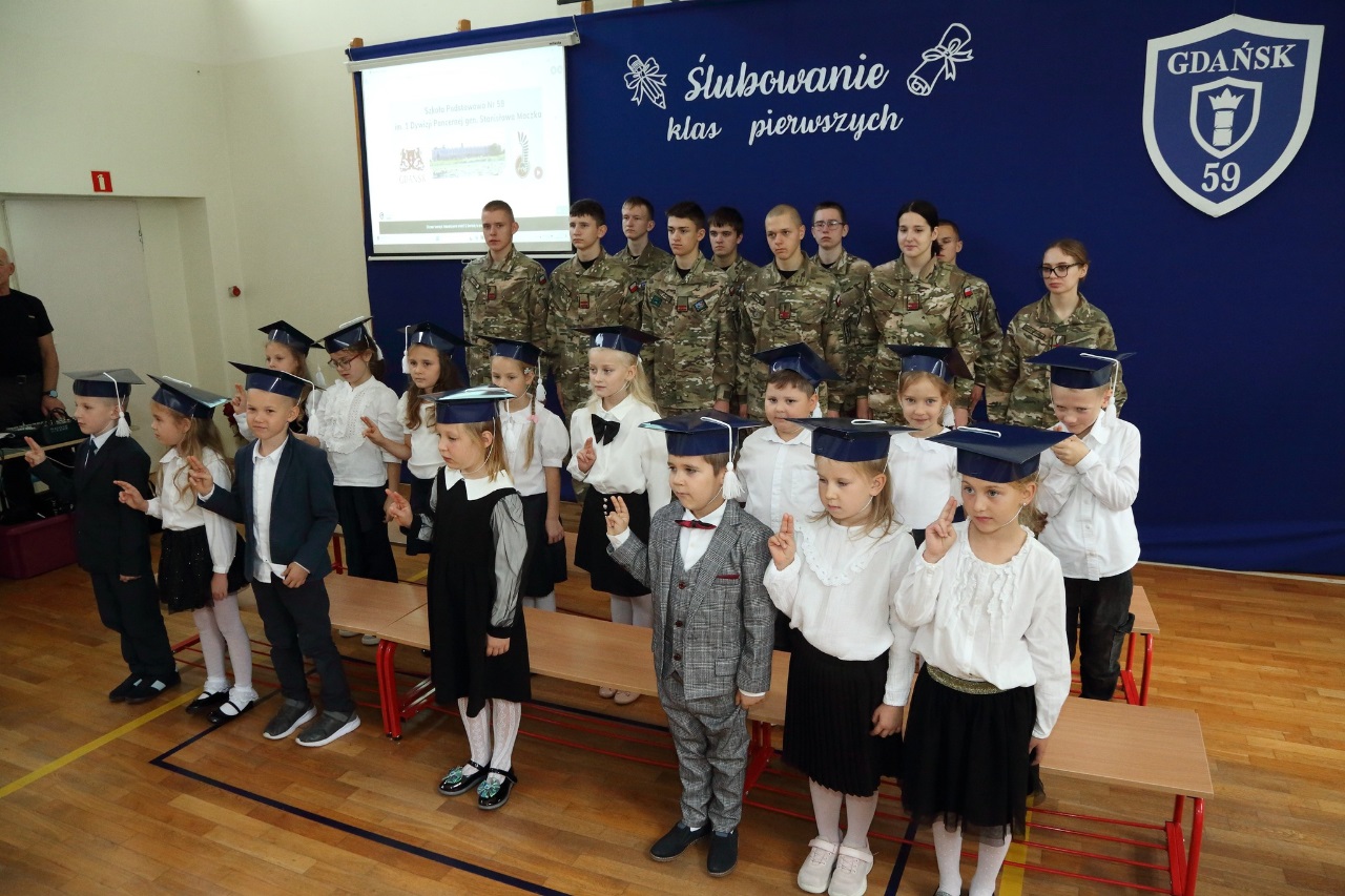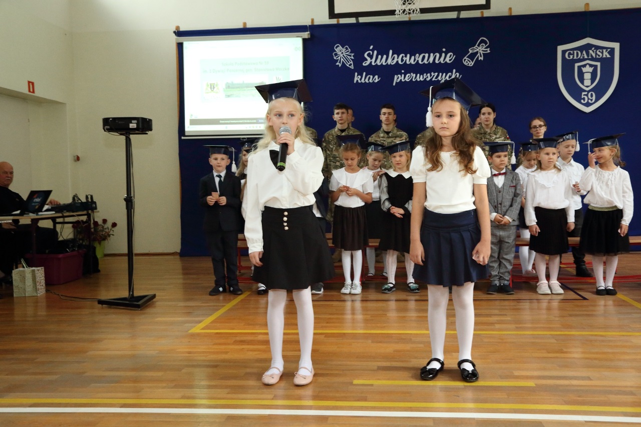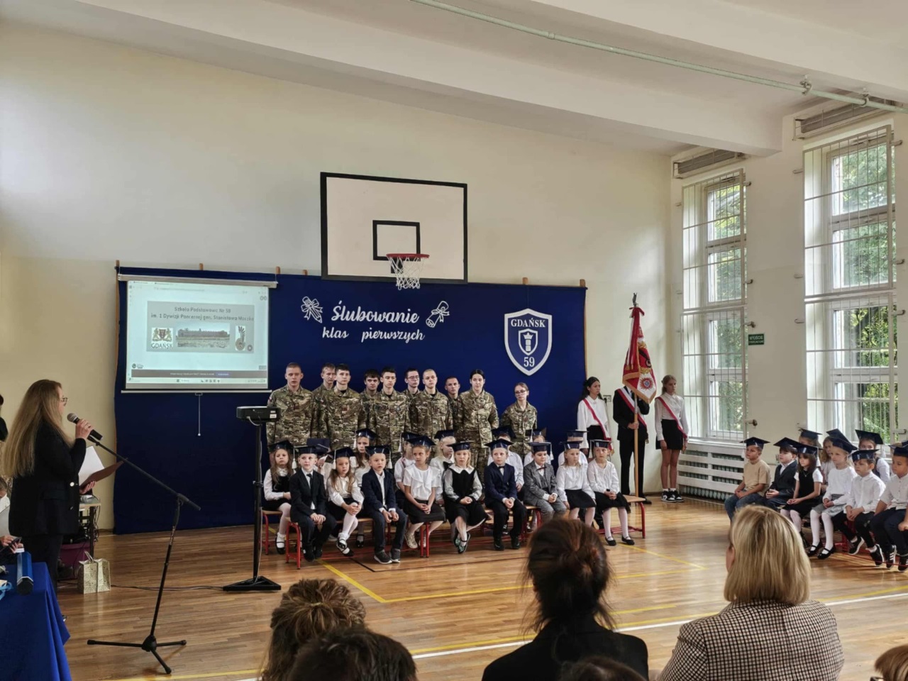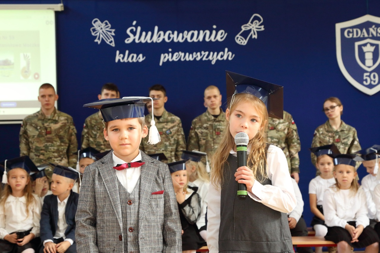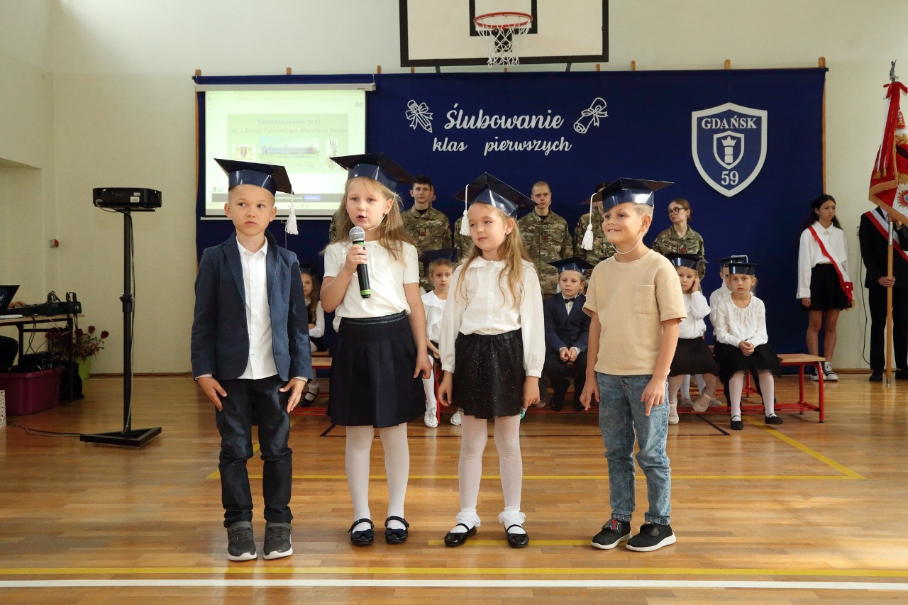 Najmłodsi uczniowie pięknie zaprezentowali się w programie artystycznym - były wiersze, piosenki i uśmiechy, które skradły serca wszystkich obecnych. Pierwszoklasiści pokazali również, że mają już wiedzę na temat szkolnego patrona. W trakcie występu zostali oficjalnie powitani w szkole przez uczniów klas starszych.