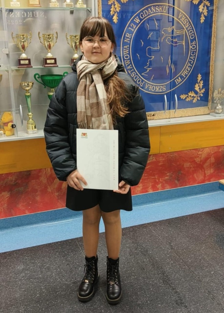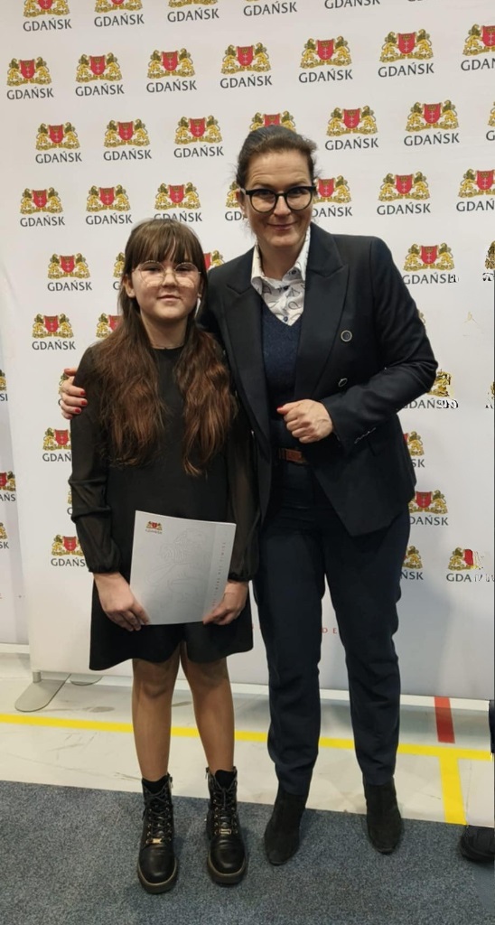 W poniedziałek 16 lutego na gali w SP 16 odbyło się uroczyste wręczenie stypendiów Prezydenta Miasta Gdańska. Takie wyróżnienie otrzymała uczennica naszej szkoły, Wiktoria z klasy 5A. Wiktoria została doceniona nie tylko za wysokie wyniki nauczania, ale również za działalność wolontariacką i osiągnięcia taneczne.
