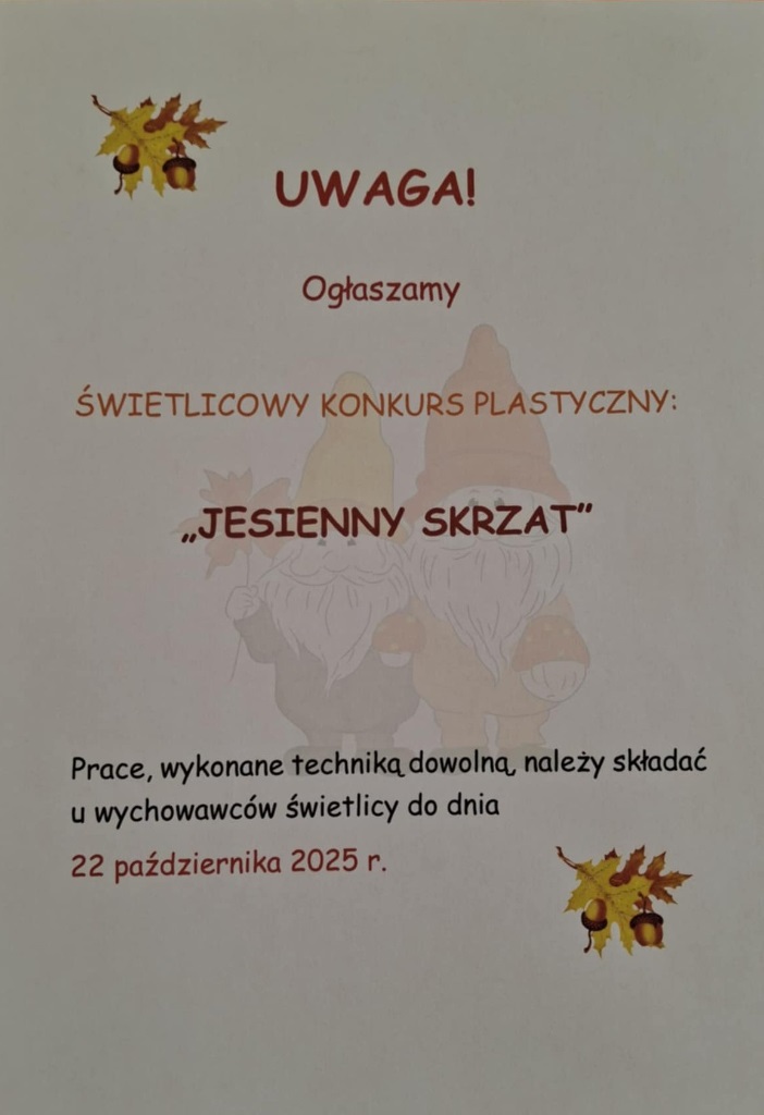 Ogłaszamy konkurs artystyczny dla uczniów świetlicowych. Zapraszamy wszystkich, którym w duszy jesień gra i kto lubi zanurzać się w świat wyobraźni.